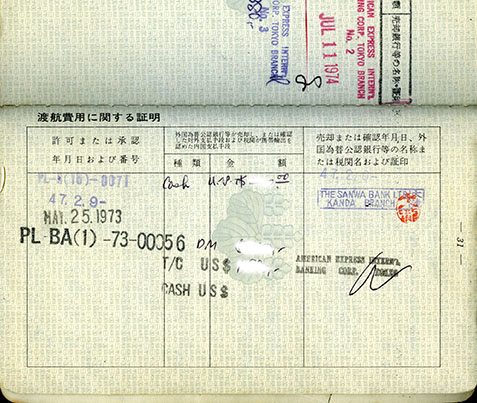 海外への外貨(ドルやドイツマルク)持ち出しも制限があってパスポートに金額を書く欄(写真参照)まであり、外為窓口のある銀行にパスポート持参でキャッシュやトラベラーズチェックの交換をした。